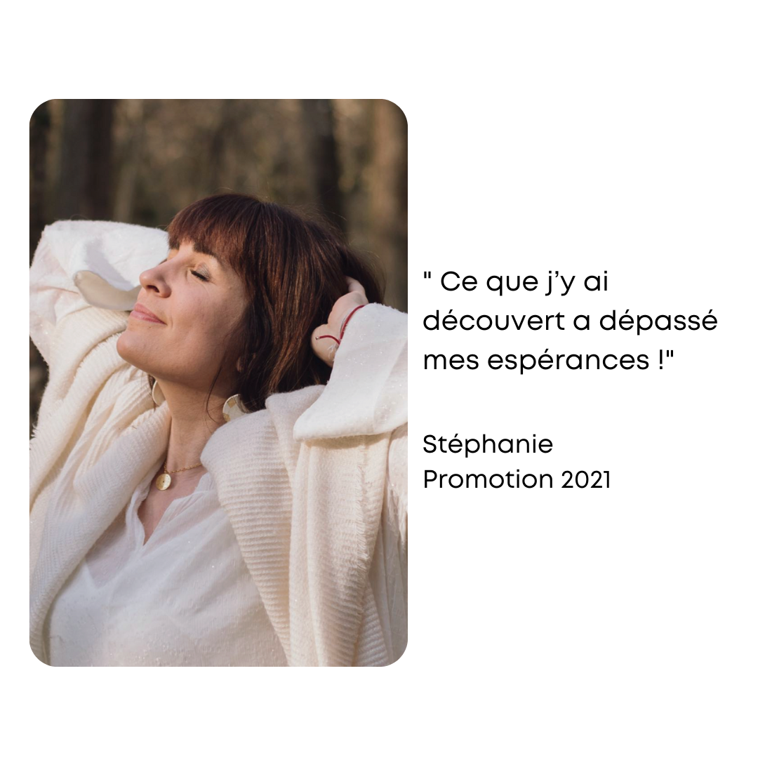 "Cette formation m’a appelé au moment où je pensais à ma reconversion professionnelle. J’avais déjà suivi des formations en soin énergétique sur mon temps personnel. J’ai été éducatrice spécialisée pendants 10 auprès de différents publics. Après un burn out et un bilan de compétence, j’ai compris que je souhaitais modifier ma manière de fonctionner professionnellement. J’ai décidé de devenir auto-entrepreneuse et d’accompagner des personnes qui en font le choix et utiliser des thérapies alternatives pour les aider sur ce travail qu’elles entreprennent.